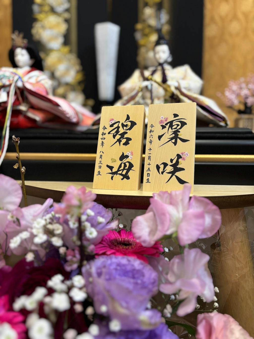 2歳0歳姉妹の親です。命名書も名前札もこちらで作っていただきました。文字も素敵でイラストまで素敵な命名書や名前札はなかなかなく、こちらで2人ともお願いしています。細かい要望にもしっかり答えていただき、2人とも大満足な仕上がりになりました。お雛様を二つ置くか迷いましたが、部屋の収納スペースや飾るスペースの問題もあり諦めました。名前札なら2人並べて飾ることができるので世界に一つの名前札を2人分用意してあげることができました。お雛様の雰囲気や二つ並べた時の統一感なども考えてお作りいただき大満足です。木箱の入れ物もあるので収納する時も壊れる心配がなく便利でした。ありがとうございます。